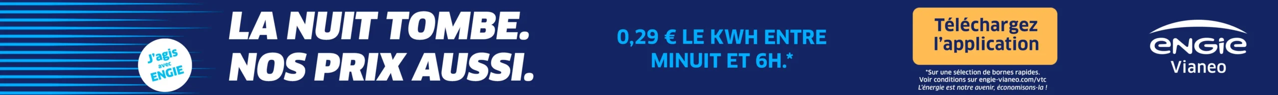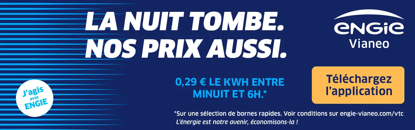 Offre valable du 14.01.2026 au 30.04.2026 inclus, uniquement sur les recharges effectuées de 00h00 à 6h00, sur une sélection de bornes rapides ENGIE Vianeo en France – voir liste des stations éligibles ci-dessus. Offre réservée exclusivement aux membres du programme de fidélité ENGIE Vianeo+.